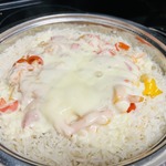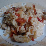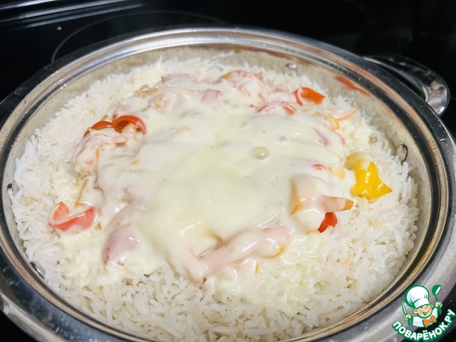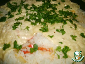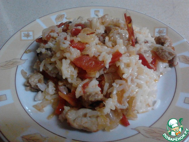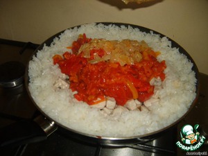 Рис выложить на сковороду кольцом, в середину положить индейку и все овощи.