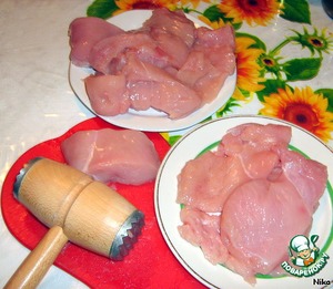 Куриное филе порезать на равные части и слегка отбить с обоих сторон.