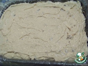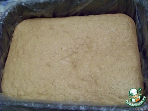 Делаем тесто: взбиваем яйца и сахар, затем всыпаем муку и разрыхлитель. В смазанную форму выливаем тесто тонким слоем и выпекаем при 180 град. около 20 мин. Если форма разъемная – это идеальный вариант, остужаем корж и делаем начинку. Если неразъемная, тогда вытаскиваем корж, кладем пищевую пленку в форму, оставив со всех сторон края, достаточные для того, чтобы потом вытащить готовый торт.