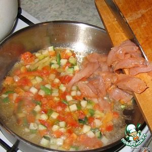 На разогретую сковородку выложить замороженные овощи, прогреть, добавить курицу, обжарить