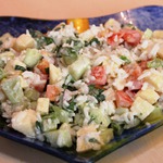 Рис горкой выложить в салатницу, по бокам разместить помидоры и яблоки. Огурцы выложить по всему блюду.