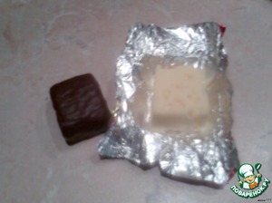 Всю эту конструкцию накрываем вторым сапожком и слегка прижимаем сверху. Делаем глазурь: взбить миксером 200 гр. майонеза, набухший желатин нагреть, не доводя до кипения, выливать струйкой в майонез, не переставая взбивать. Охладить в холодильнике минут 10, но не дольше, а то зажелируется.
