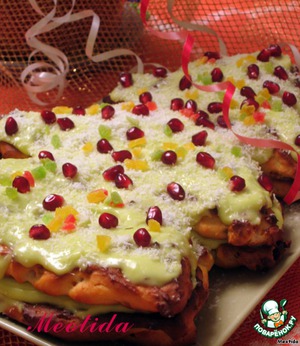 посыпаем кокосовой стружкой (по желанию), гранатом (или клюквой), измельченными цветными цукатиками..