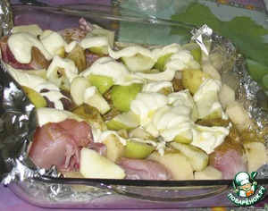 • Последним слоем кусочки яблок. Заливаем сметаной. Для снижения калорийности сметану можно заменить 200-300 мл молока. Сверху немного майонеза.