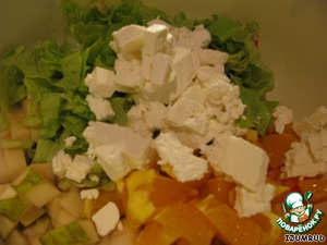 кубиком нарезать брынзу и добавить в салат