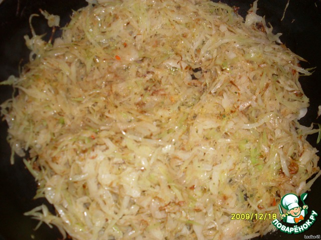 Капусту вместе с луком обжарить на растительном масле. Посолить, поперчить. Остудить.