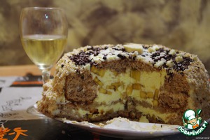 Сборка торта: плоский бисквит смазываем кремом, укладываем сверху бисквитное кольцо, образовавшийся "колодец" заполняем порезанным бананом и заливаем полузастывшим суфле, оставлям в холодильнике на час, чтобы суфле схватилось. -