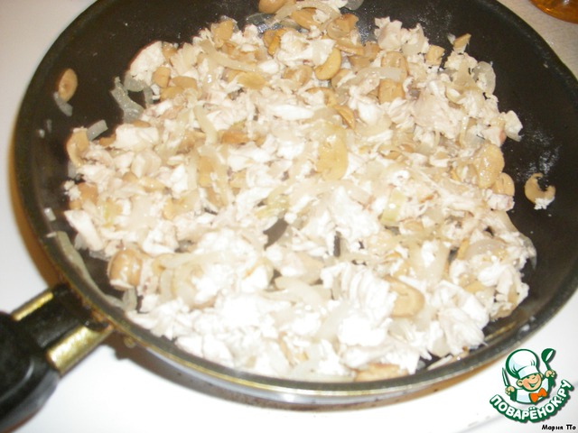 Курицу режем кубиками, добавляем к луку и грибам. Солим и перчим, перемешиваем. Жарим ещё пару минут. Отставляем остывать. -
