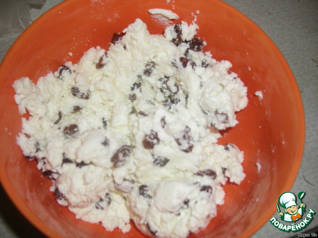Готовим сладкую начинку: к творогу добавляем чистый изюм, сахарную пудру и ванилин на кончике ножа. Перемешиваем.