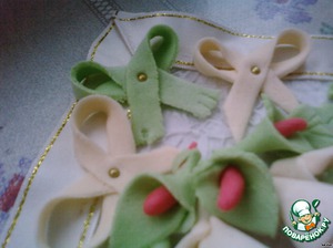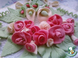 Жевательный зефир маршмелоу + масло в микроволновку. Добавляем лимонный сок + соответственный краситель (краситель растворяла в лимонном соке для равномерного закрашивания мастики), и дальше вымешивала до состояния "пластилина". Из розовой мастики лепили розочки, из зеленой - листочки, спиральки, из белой - бантики, лилии, спиральки.