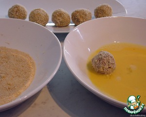 Из остывшего рагу скатываем 24 шарика, легче это делать влажными руками. Каждый шарик опускаем в взбитое яйцо, потом в сухари. По надобности повторить: панировка должна быть плотной, иначе рагу во время жарки будет вытекать. После панировки крокетам дать остыть часик в холодильнике, но можно и заморозить и потом замороженными жарить.