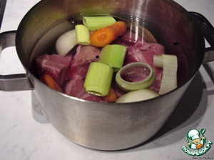 Из телятины варим бульон: мясо укладываем в кастрюльку вместе с луком, морковкой, лавровым листочком, душистым и горьким перцeм. Бульона нужно будет немного, но очень крепкого и мясо должно быть очень мягким.