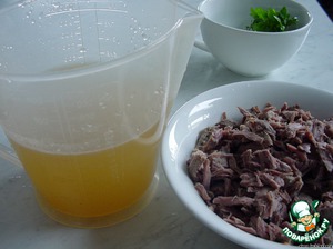 Из остывшего бульона вынимаем мясо, режем его на маленькие кубики и руками разделяем на волокна. Бульон процеживаем.