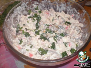 Крабовое мясо порезать кубиками. Кальмары порезать полосками. Яйца порезать кубиками. Остудить мидии с грибами. Все смешать.