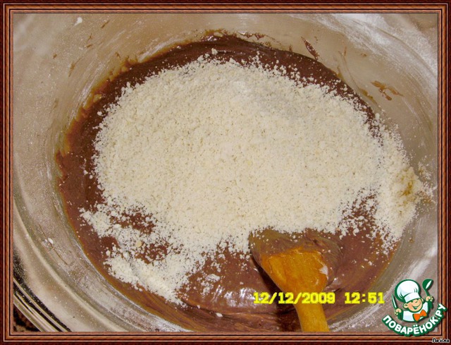 • Добавить молотый миндаль, перемешать. Должна получиться жидкая смесь.