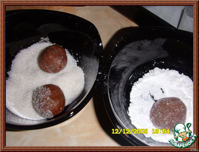 Обвалять каждый шарик в сахаре, а затем в сахарной пудре. (Для усиления эффекта надо обвалять шарики в сахарной пудре дважды, с промежутком в несколько минут.)
