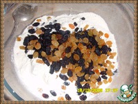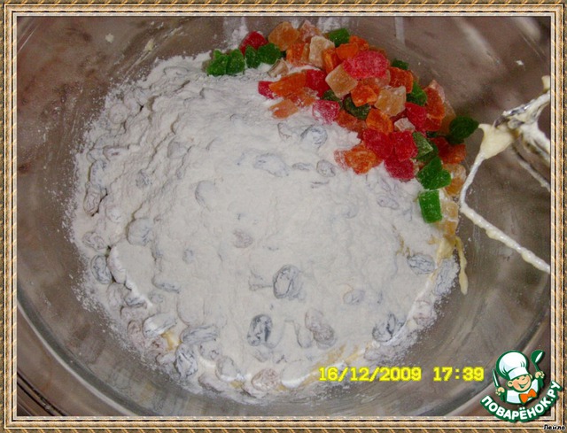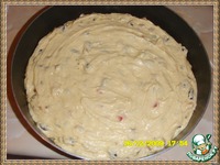 Перемешать с яично-сливочной массой. Туда же вмешать цукаты, глазированную вишню ([b]у меня не было вишни[/b]), разрезанную пополам, |