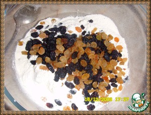 Слова автора. Вымытые и просушенные сухофрукты смешать с мукой и пекарским порошком. |
