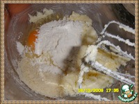 До кремообразного состояния. Продолжая взбивать, по одному добавить яйца. С каждым яйцом понемногу подсыпать молотый миндаль и муку (1-2 ст. л.). |