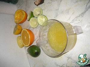 • Выжать сок 1/2 апельсина, 1/2 лимона и двух лаймов, залить эту не менее ароматную жидкость в блендер.