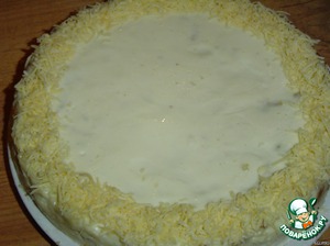 Для верхнего коржа и боковин готовим сырно-майонезную глазурь. Сливки нагреваем до температуры 70-80 гр., добавляем быстрорастворимый желатин и перемешиваем до его растворения, а затем процеживаем. К сливкам добавляем плавленый сыр, 5 ложек майонеза и взбиваем в блендере до однородности.