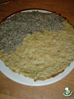 Форму для выпекания смазываем маслом, выкладываем 1/3 часть фарша, разравниваем и выпекаем в духовке 15 минут при температуре 180 гр. Таким образом, получаем 3 коржа.