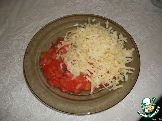 Помидор режем кубиком, сыр трем на крупной тёрке, чеснок - на мелкой.
