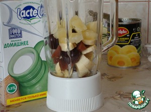 Банан и фрукты из компота (у меня яблоки со сливами), ананас измельчить в блендере, предварительно добавив немного молока и сиропа от компота.
