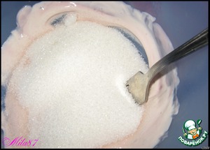 Смешиваем в миске сметану и йогурт, всыпаем сахар и взбиваем вилочкой до растворения сахара.