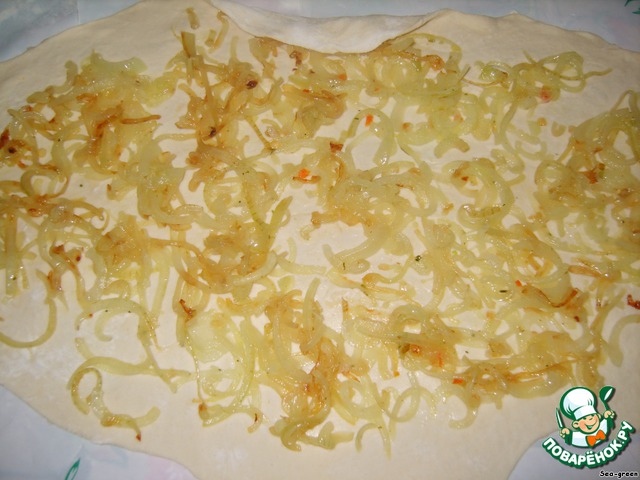 Тесто раскатать в тонкий пласт и выложить сверху ОСТЫВШИЙ лук. Разровнять и свернуть в рулет.