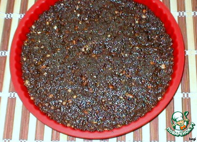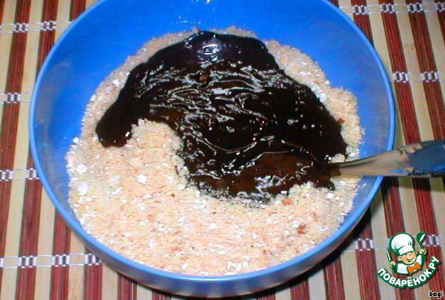 Шоколадную массу соедините с крошкой из печенья и орехов, выложите на блюдо и охлаждайте в холодильнике 1,5 - 2 часа.