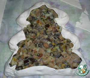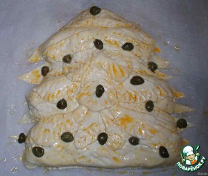 Сверху положить вырезанные из второго куска еловые "лапки". Оставленным для смазки яйцом, намазать сверху ёлочку.