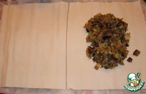 Тесто разложить на пекарскую бумагу и разрезать пополам. На одну сторону выложить всю начинку.