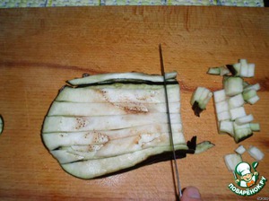 Баклажаны (предварительно обсыпанные солью и оставленные на достаточное время - для удаления горечи) нарезать мелкими кубиками.