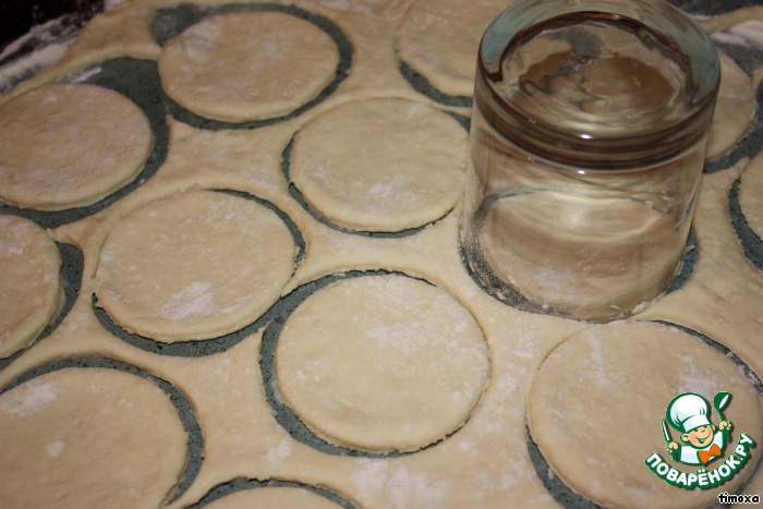 Тесто раскатать на присыпанной мукой поверхности примерно толщиной в 0,5 см. С помощью стакана вырезать кружки.