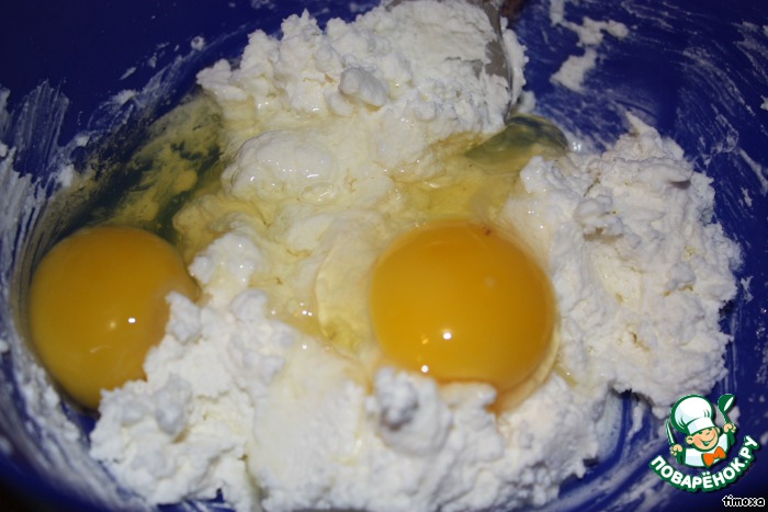 Творог растереть со сметаной, солью, сахаром. Добавить разрыхлитель и яйца. Затем добавляем муку и замешиваем мягкое эластичное тесто. Мне потребовалось чуть больше муки, смотрите сами, добавляем, пока тесто не перестанет липнуть к рукам.
