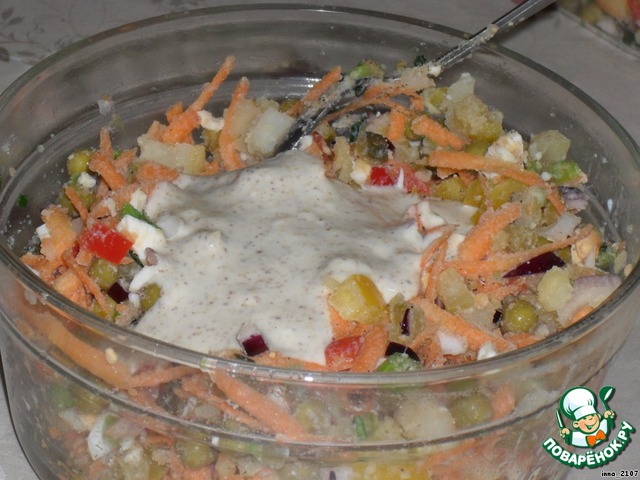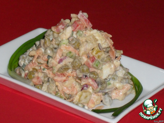 Рецепт с сайта "Кулинар" от кулинара irisli. Нам салат очень понравился, спасибо автору рецепта. Этот салат - отличная замена салату оливье, может выполнять его функцию, особенно для вегетарианцев и тех, кто задыхается от обилия мясного на столе (слова автора рецепта).