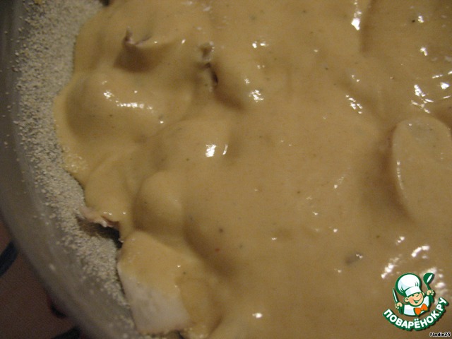 Выливаем тесто и даем постоять минут 5, чтоб тесть проникло между начинкой.