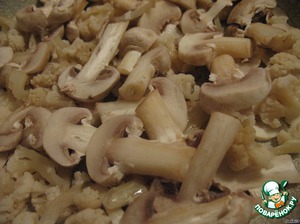Капусту и грибы нарезаем пластинками и кладем на дно противня.