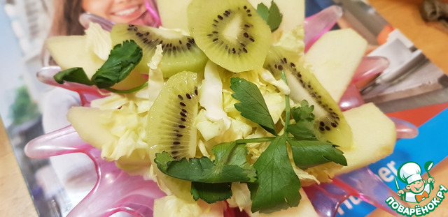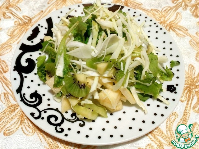Все перемешать (мешаю руками, чтобы вкусы яблока, киви и капусты перемешались), заправить маслом (предпочтительно оливковым).