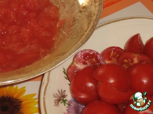 Мелко нарезать лук, зелень. Крупный помидор натереть на терке, помидоры черри разрезать пополам.