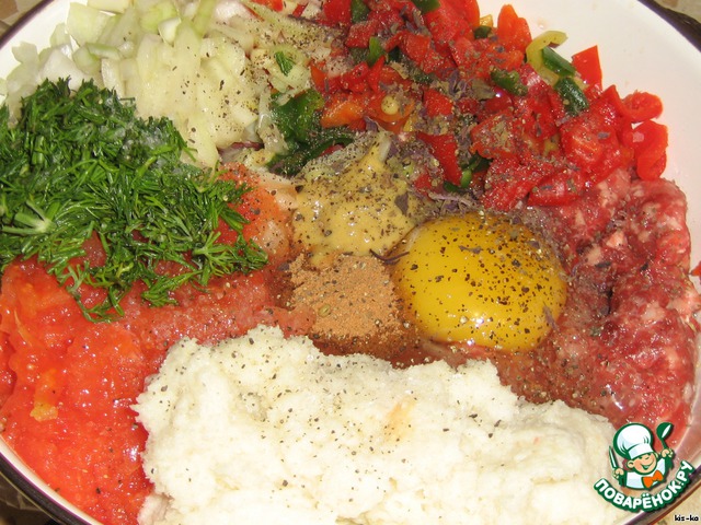 Соединить фарш со сладким перцем, хлебом, луком, зеленью, тертым помидором, добавить сырое яйцо, горчицу, мускатный орех. Посолить и поперчить по вкусу. Хочу отметить, что натюрморт получается просто великолепный!