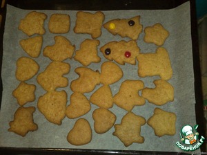 Тесто раскатываем толщиной в пол сантиметра, вырезаем фигурки и выкладываем на противень неплотно, потому как печенье немного вырастает в духовке. В этом году мы выпекали фигурки животных, звезды, елочку (на нее я выложила несколько M&M\'s в виде елочных игрушек).