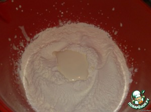 Добавляем муку. В муке делаем углубление, в него выливаем сметану. Гасим соду уксусом, выливаем в сметану.