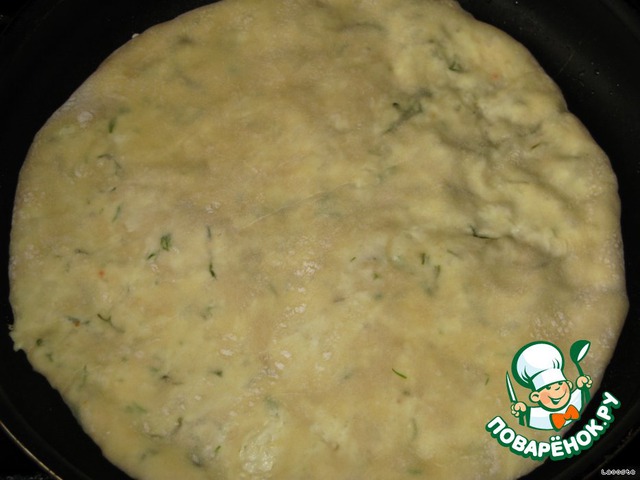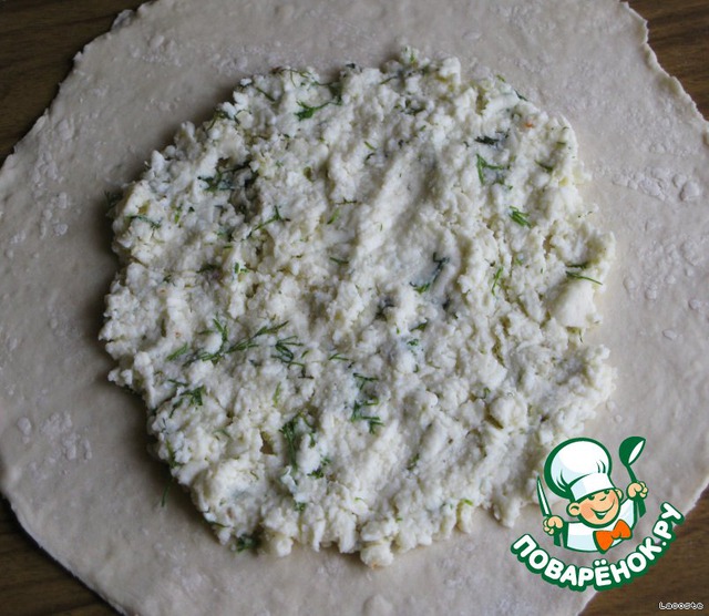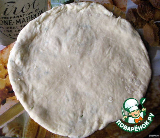 Раскатать тесто в лепешку желаемого диаметра, края у лепешки должны быть тоньше, чем середина. Выложить на середину начинку