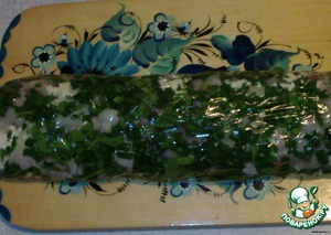 4. На пищевую пленку насыпаете зелень квадратом, на зелень - сельдь и лук.