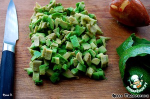С авокадо тонкой стружкой снять кожицу. Не выкидывайте - она еще пригодится для украшения. Косточку вынуть, мякоть порезать кубиками.