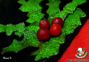 Помните оставляли кожицу от авокадо? Вырезаем из нее ножницами листочки падуба - символа Рождества. Украшаем клюквой.