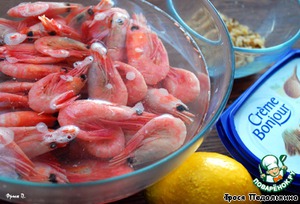 Креветки разморозить, залив кипятком. Очистить, сбрызнуть лимонным соком.