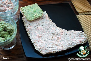 Начинаем сборку. Нижний "валенок" (так любя я прозвала этот сапожок) смазываем авокадным муссом, сверху кладем квадратик с креветочной массой.